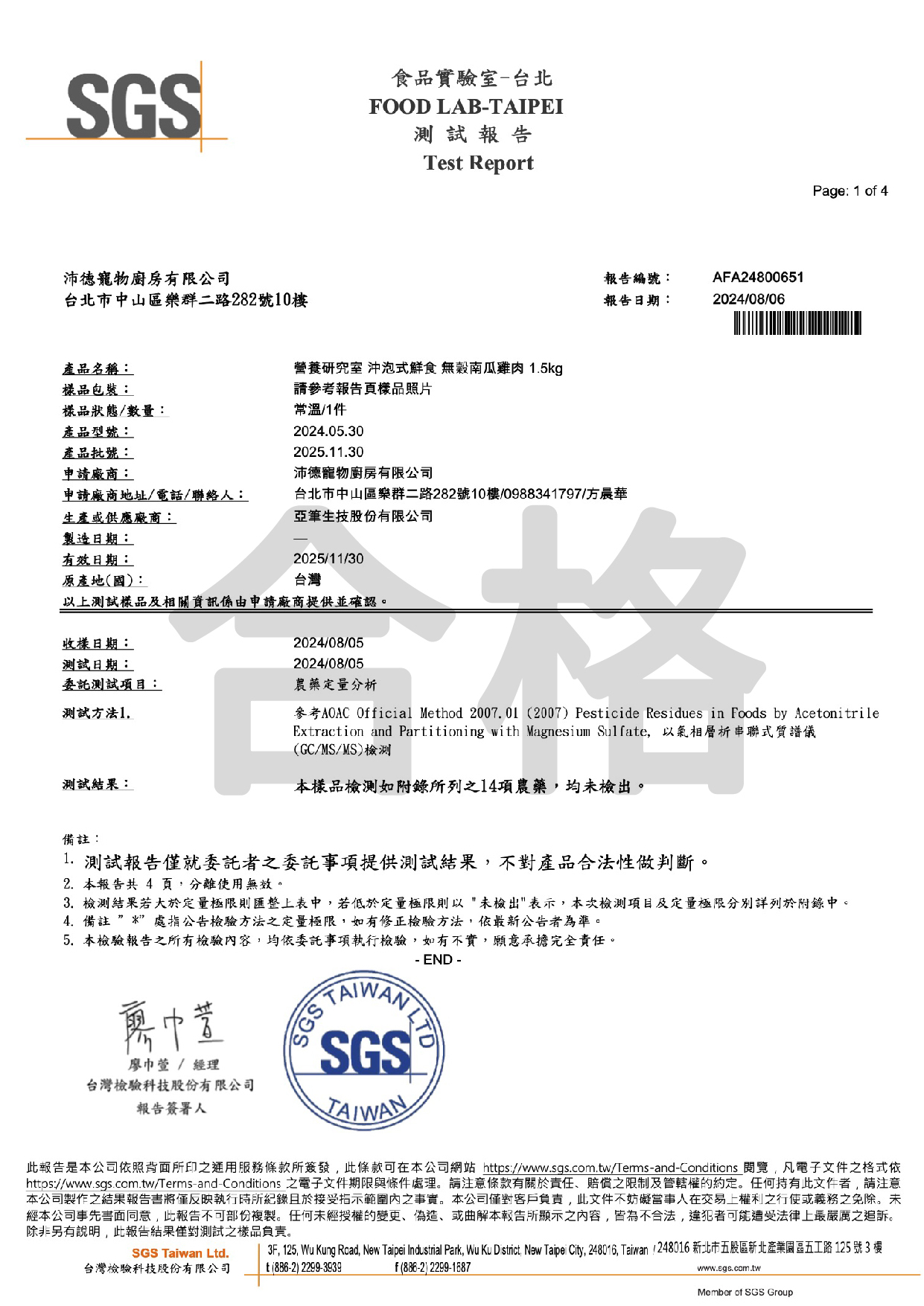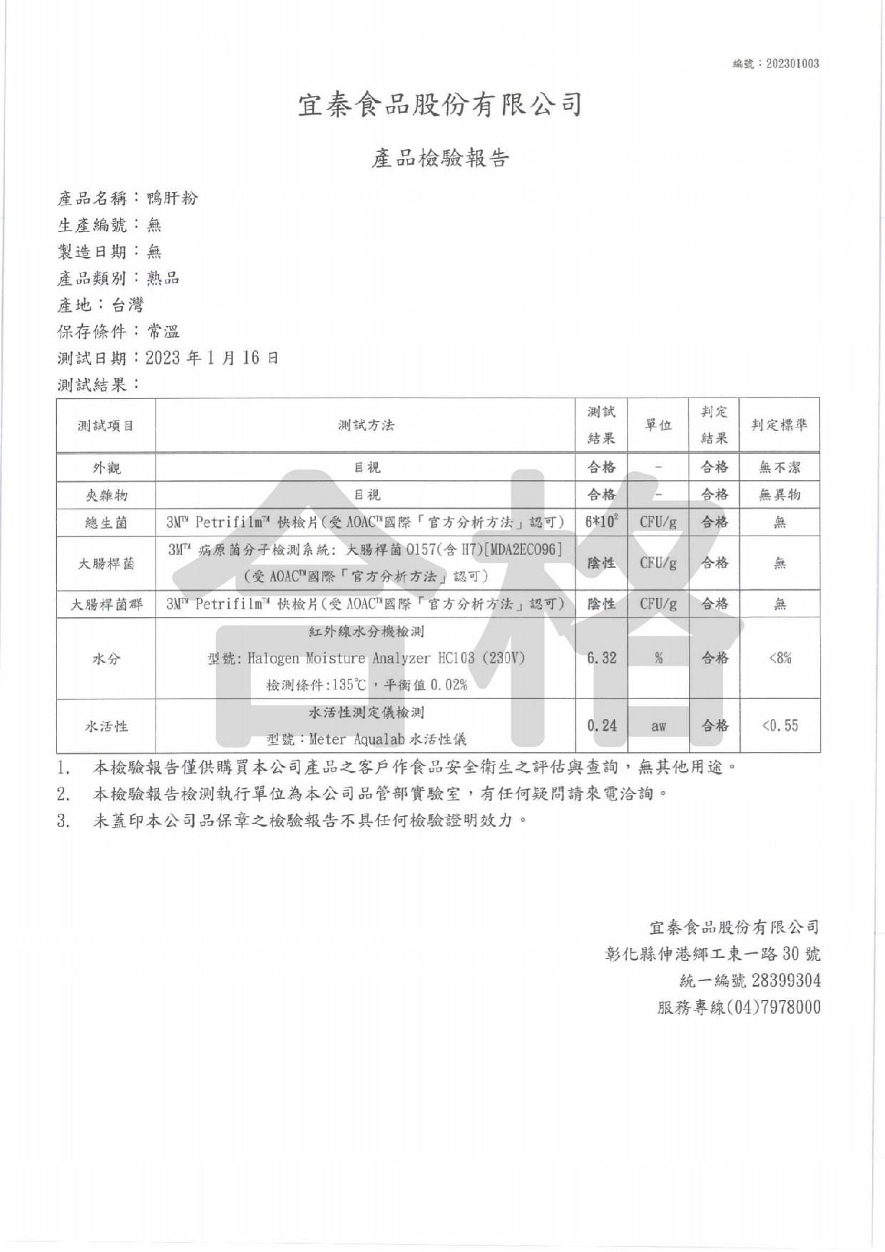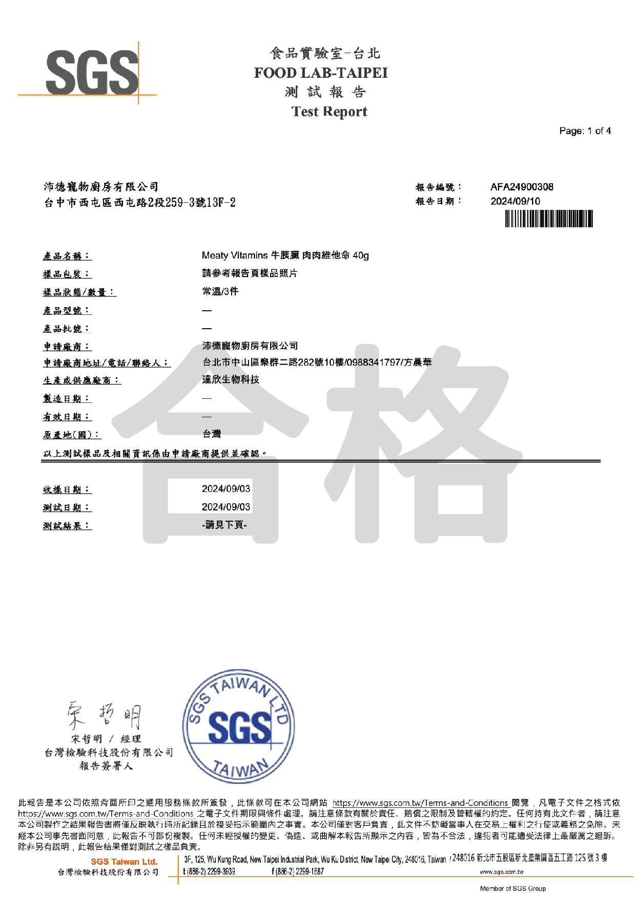 我們將定期送檢,除了規定之營養標示之外,我們另外檢驗14項農藥、四大微生物(沙門氏菌、李斯特菌、病原性大腸桿菌、產氣莢膜桿菌)及黃麴毒素,讓毛家長們能更透明的瞭解商品,也能更安心地讓毛孩食用。