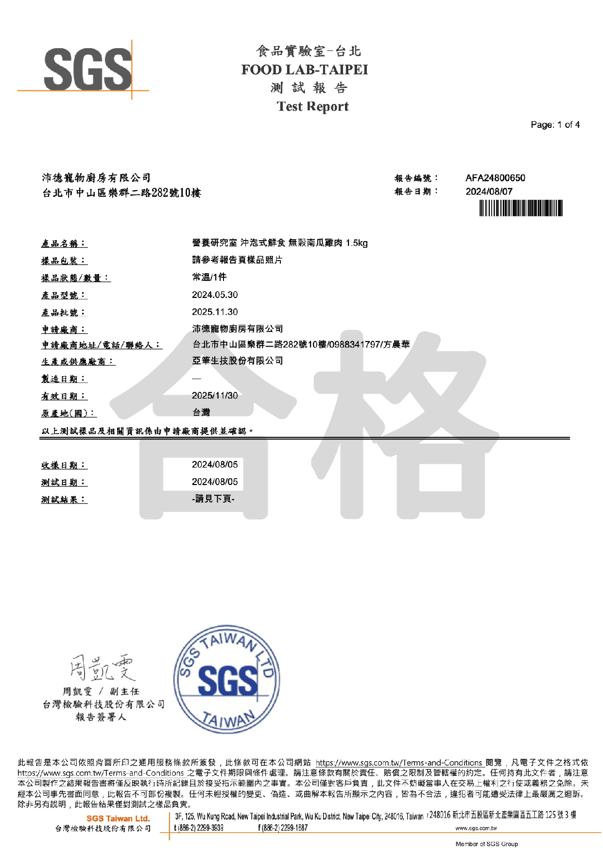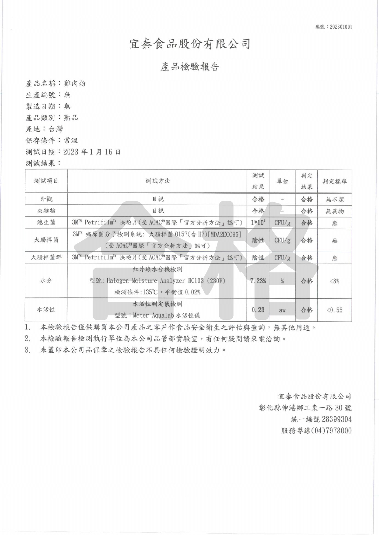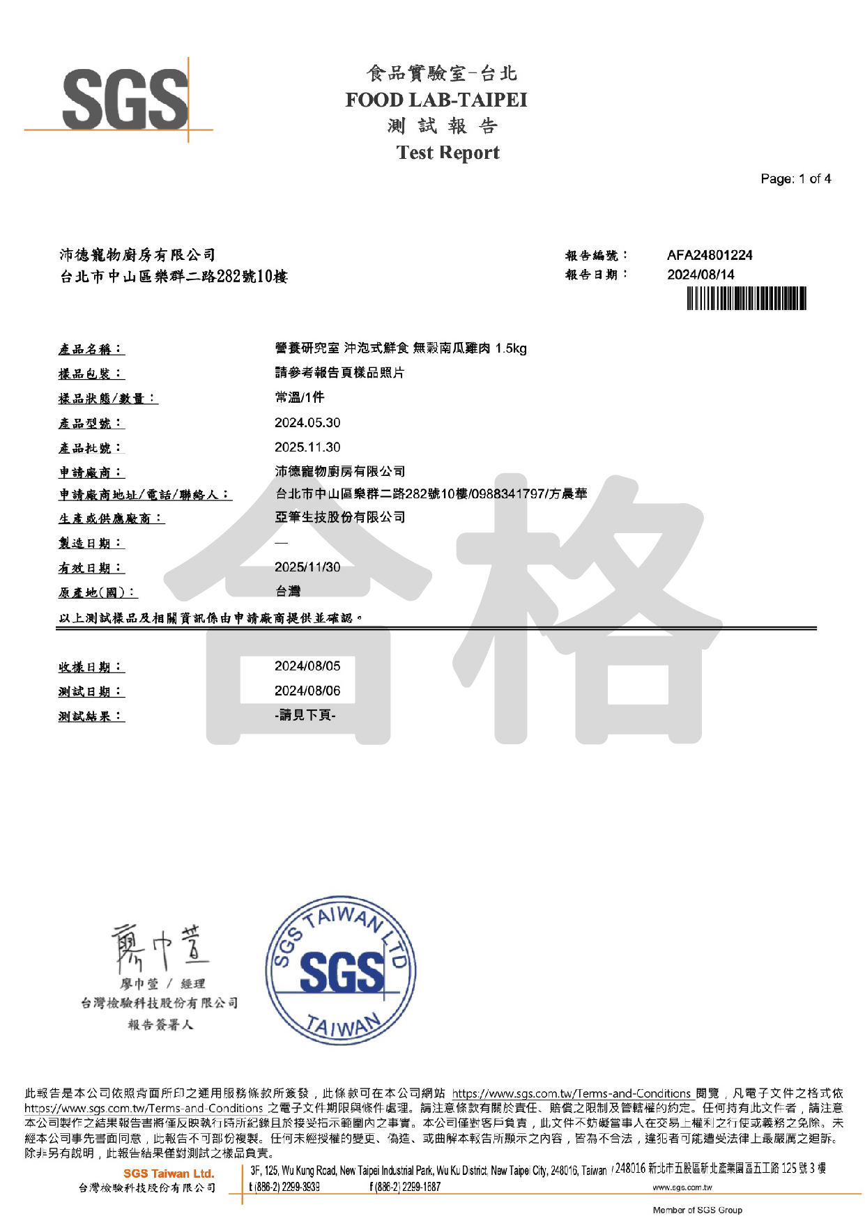 我們將定期送檢,除了規定之營養標示之外,我們另外檢驗14項農藥、四大微生物(沙門氏菌、李斯特菌、病原性大腸桿菌、產氣莢膜桿菌)及黃麴毒素,讓毛家長們能更透明的瞭解商品,也能更安心地讓毛孩食用。