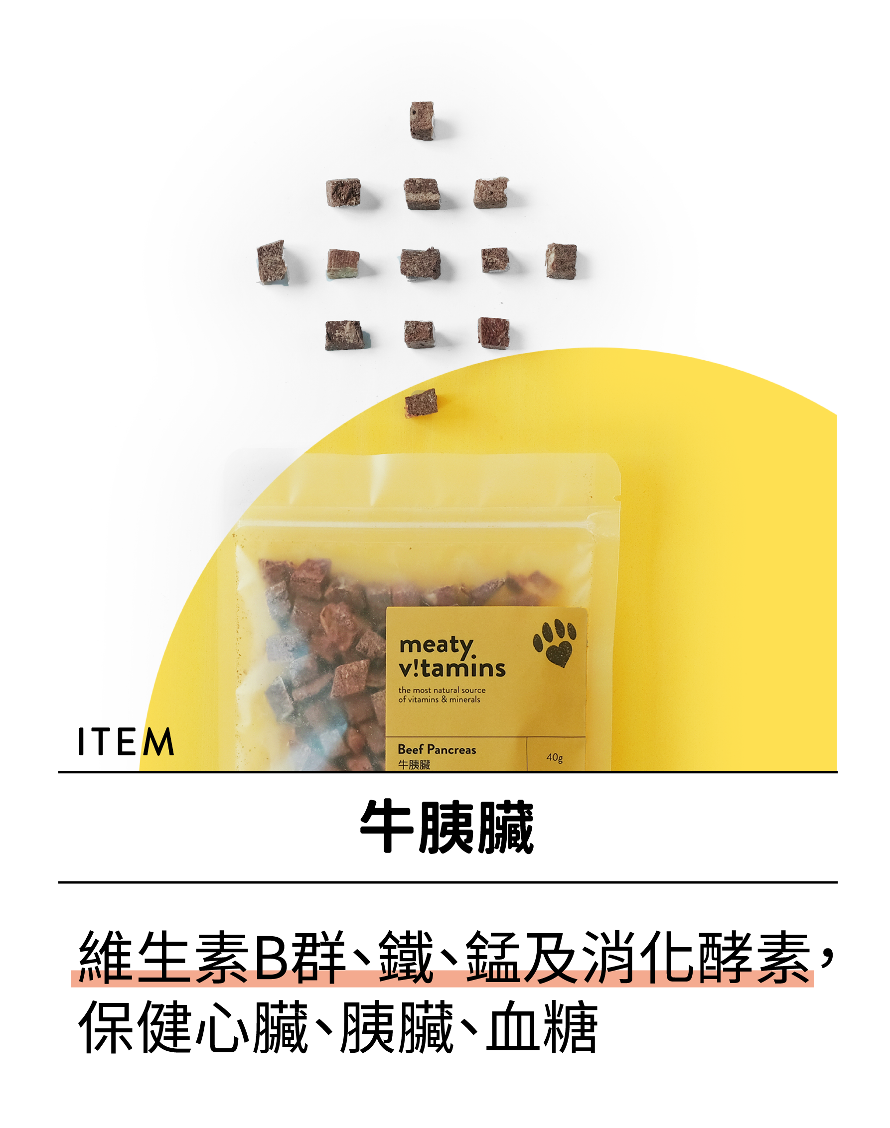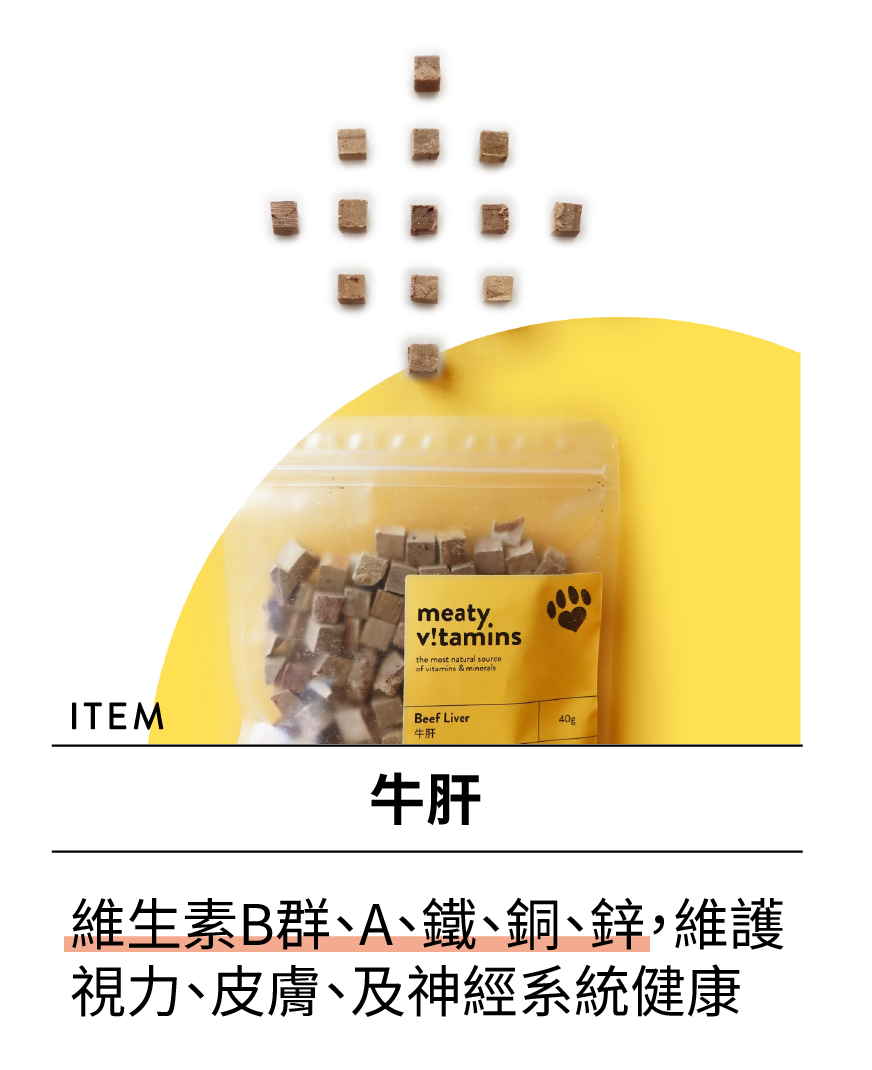 「肉肉維他命」系列為內臟原肉的凍乾零食,是最天然的維生素及礦物質來源。